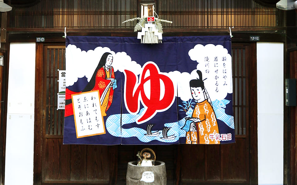 日本的な風情でお客様をお迎えするため、「小倉百人一首」からのれんが誕生。水を連想させる歌であり、男湯と女湯に別れて入っても、また後で会えるよね、という意味を込めました。