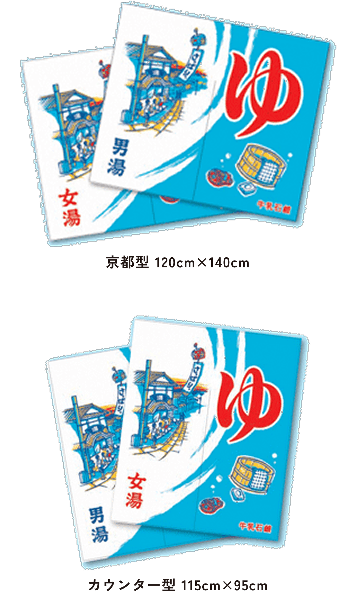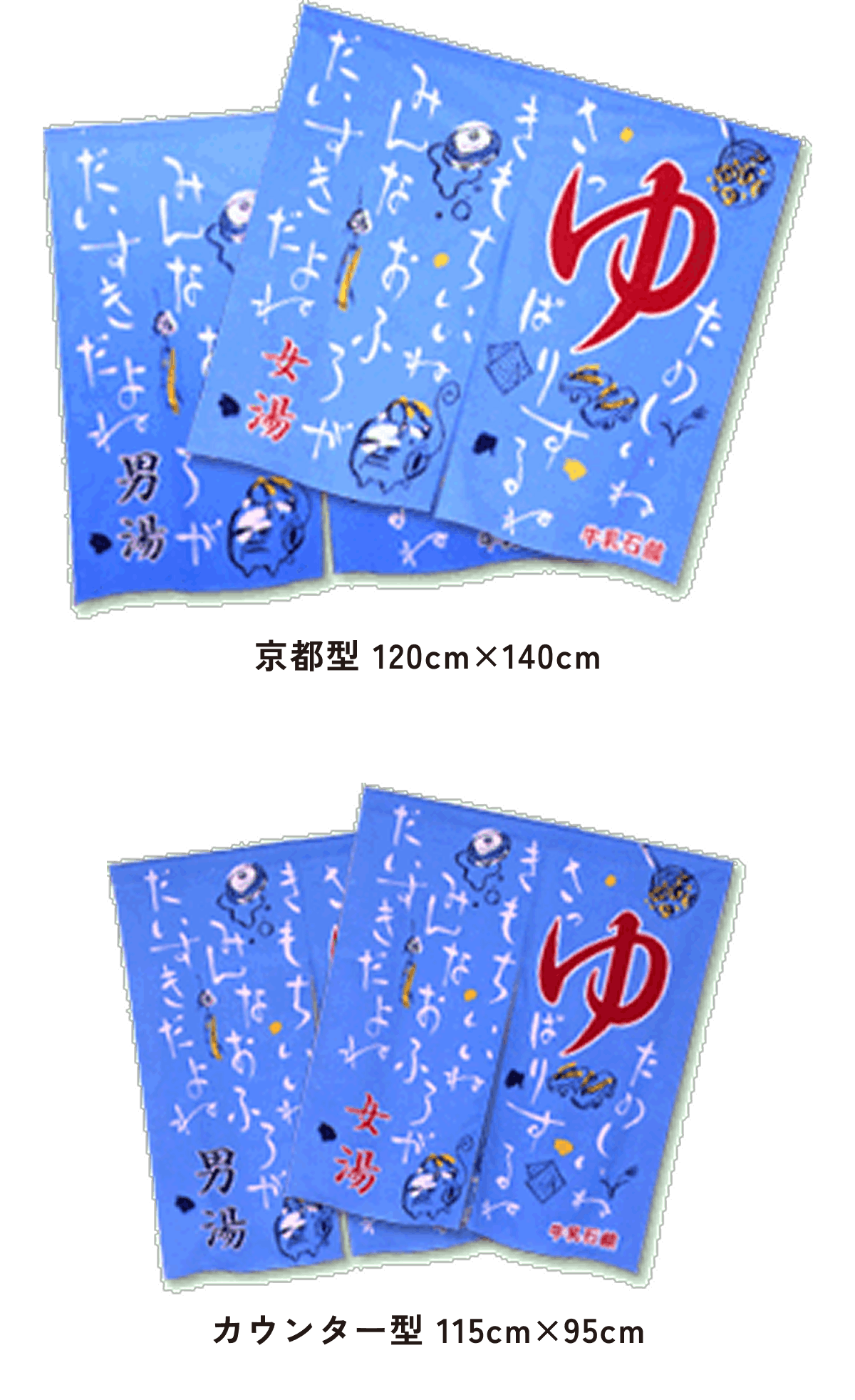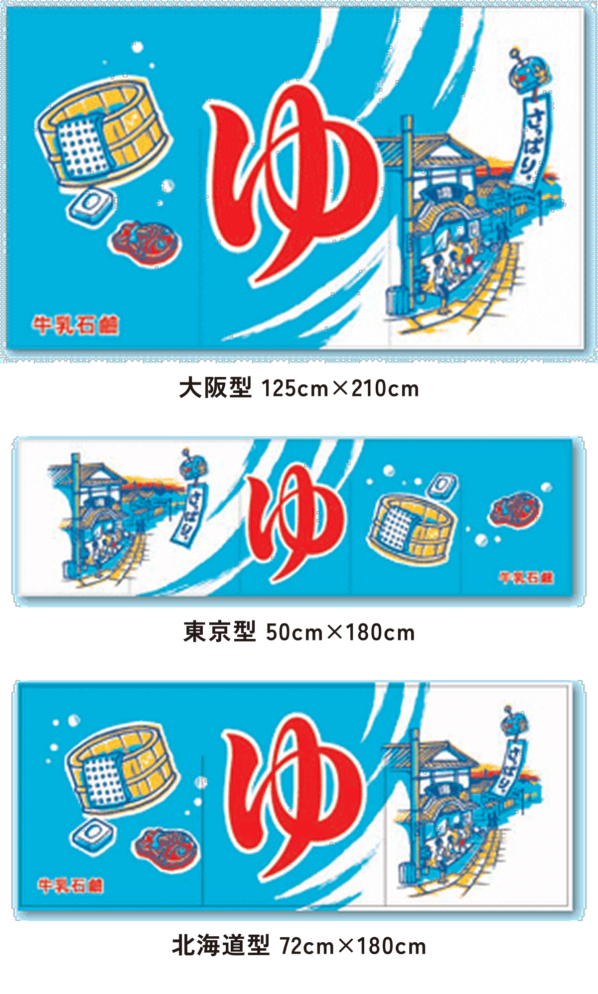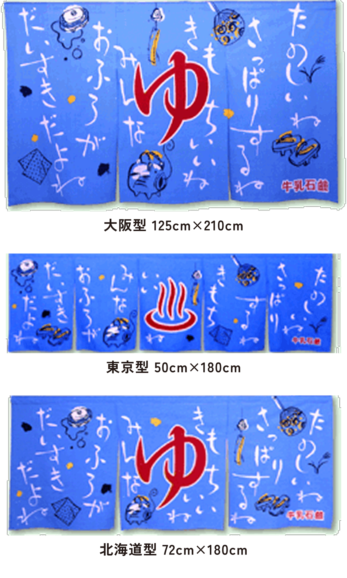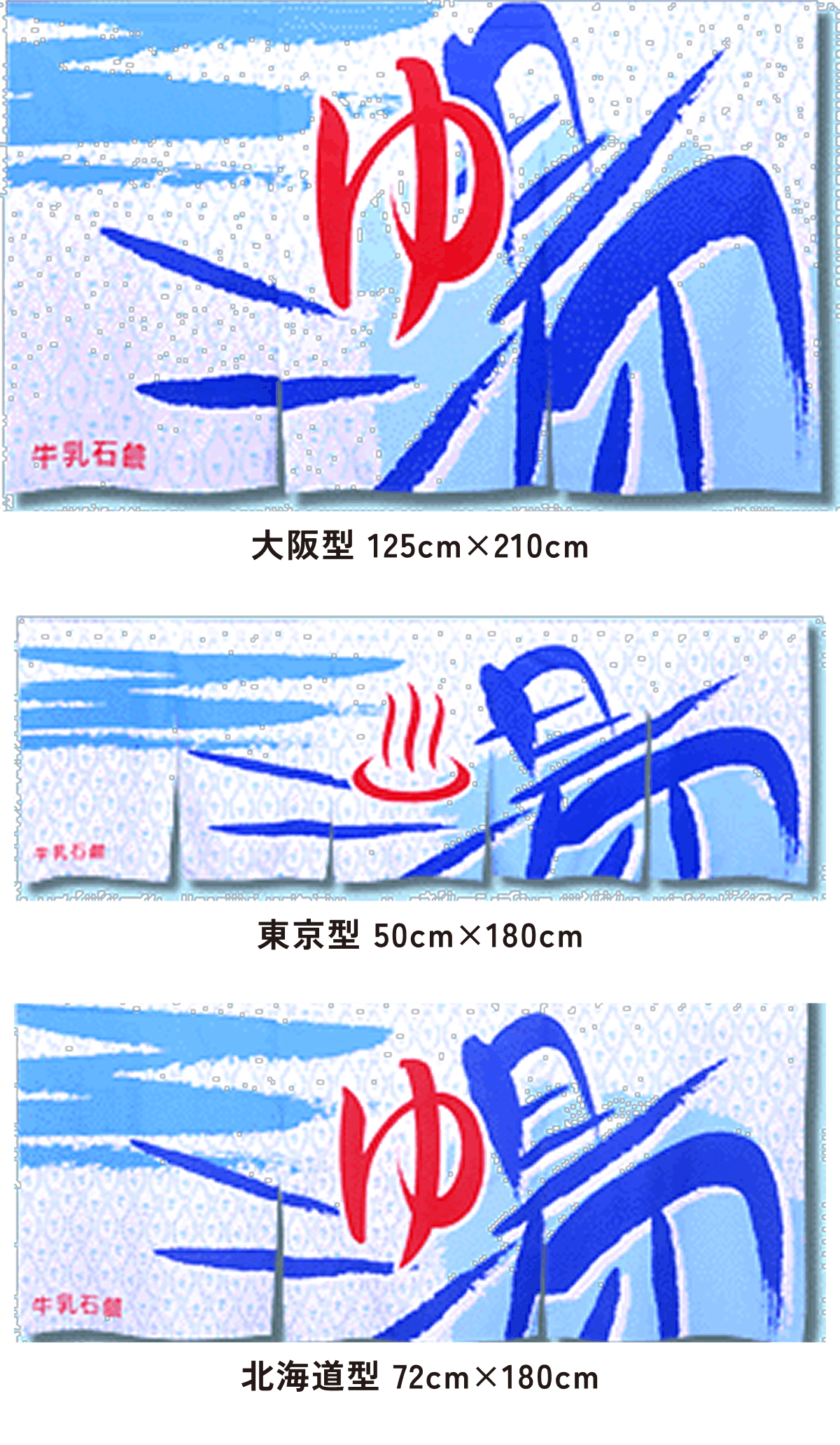 また、東京型は温泉シンボルのはいったものが多く、丈の短い横長タイプです。これは手でさっとはねあげるのを粋とする江戸っ子の美意識から生まれたようです。
