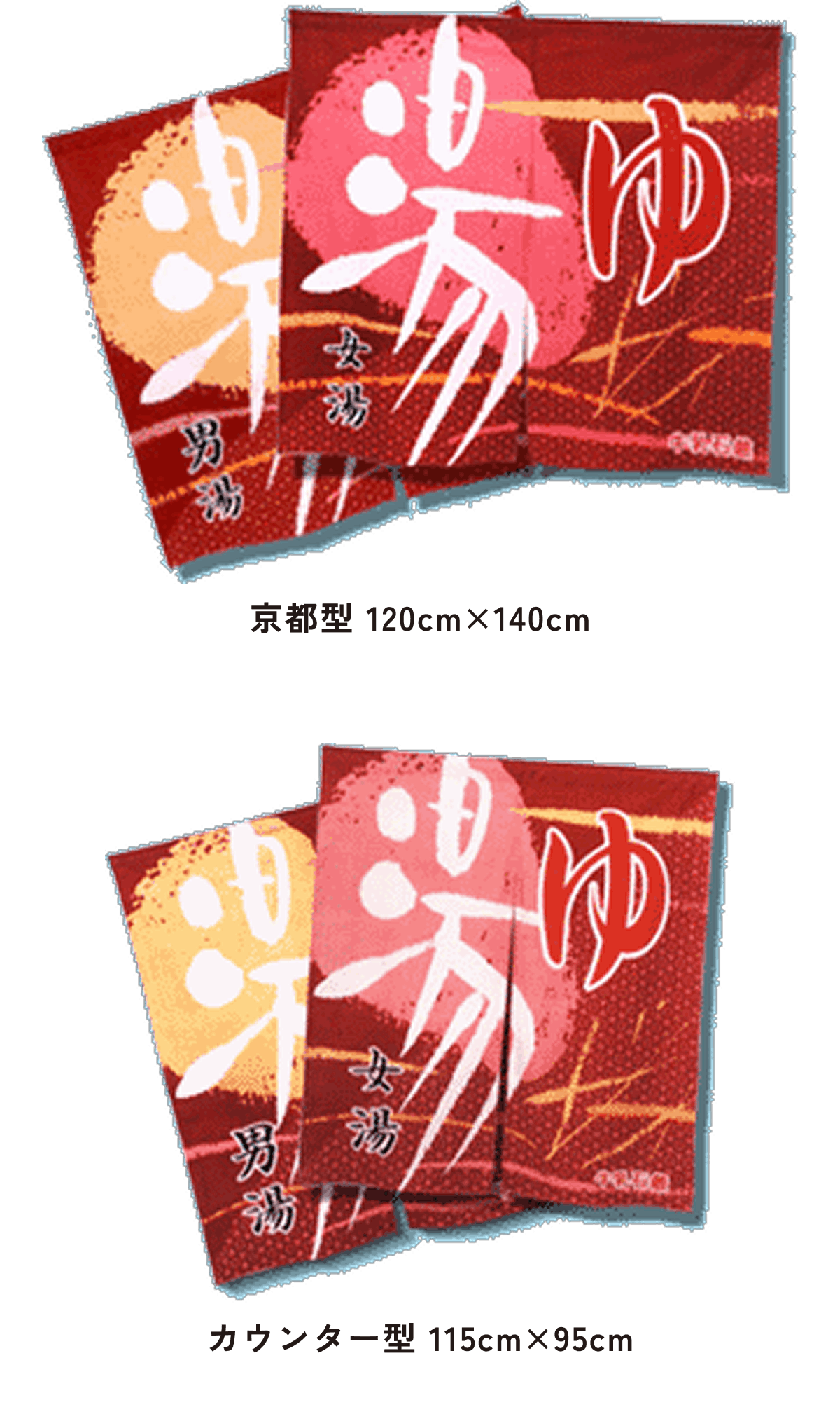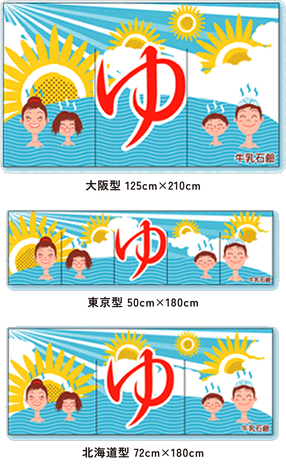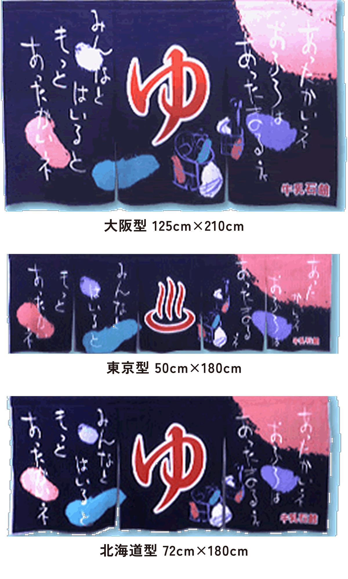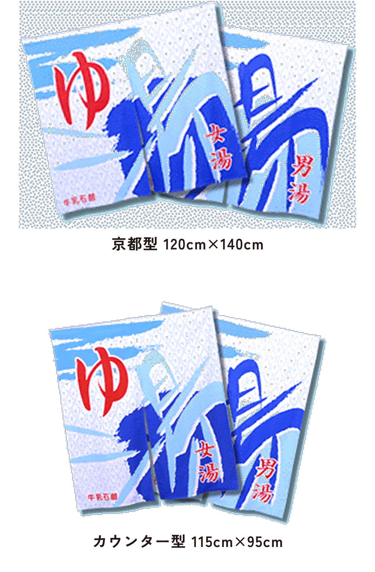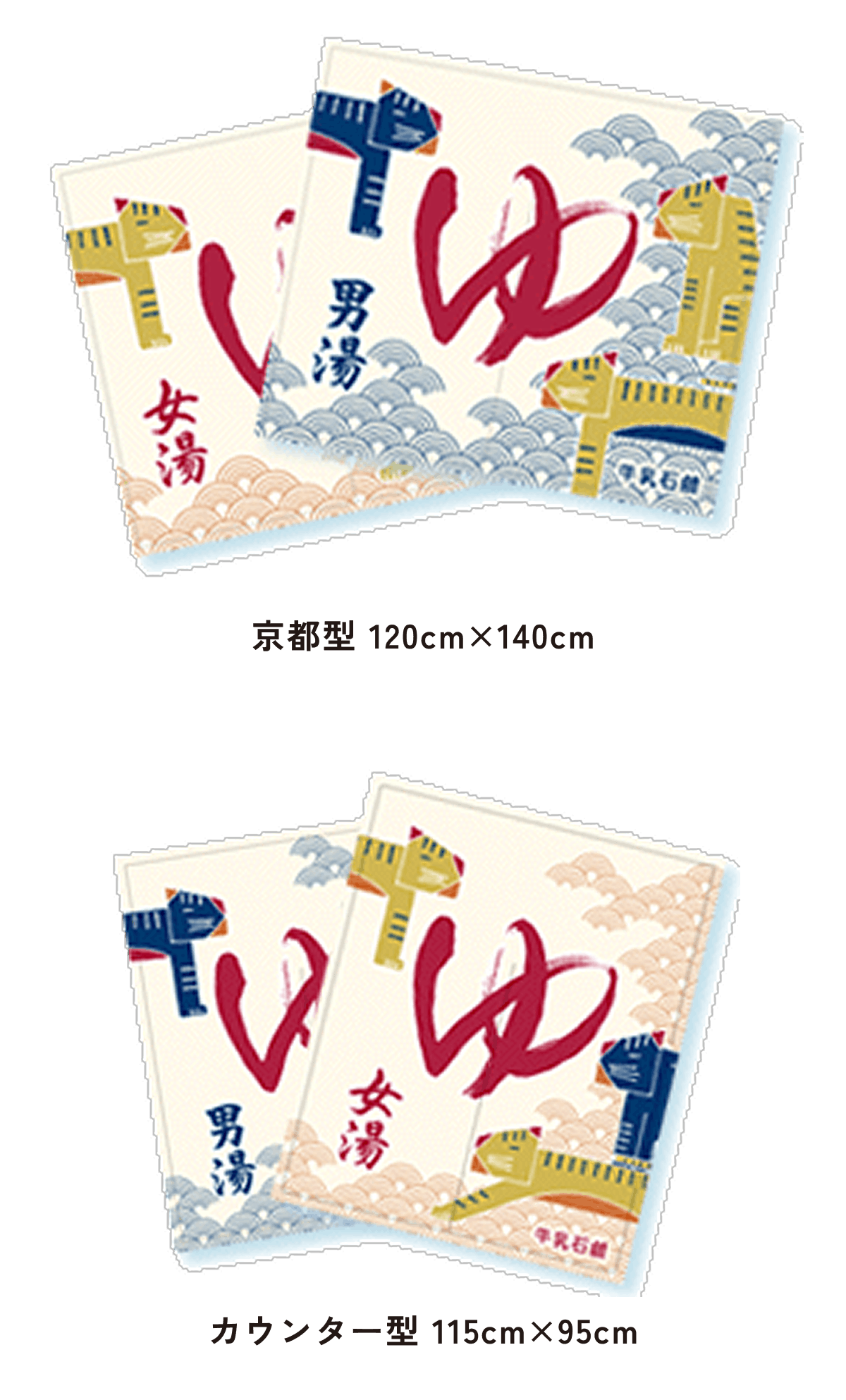 また、東京型は温泉シンボルのはいったものが多く、丈の短い横長タイプです。これは手でさっとはねあげるのを粋とする江戸っ子の美意識から生まれたようです。