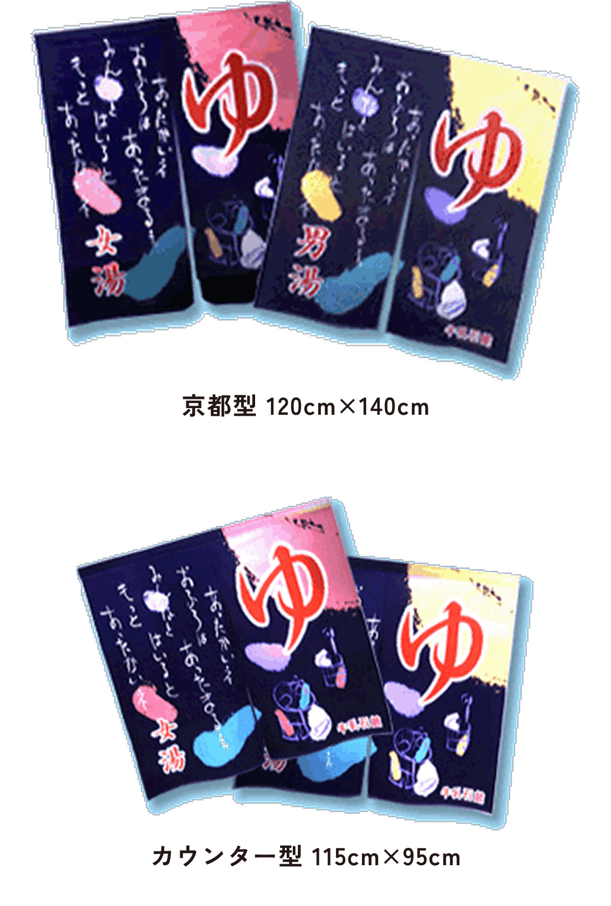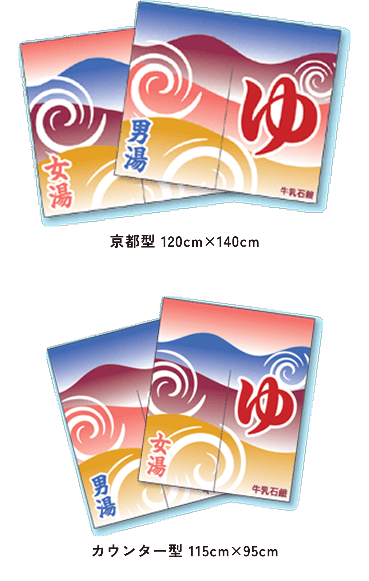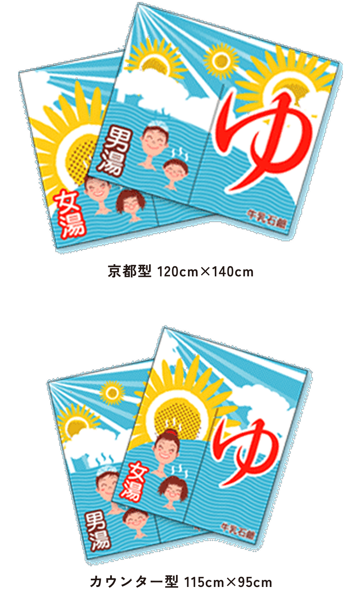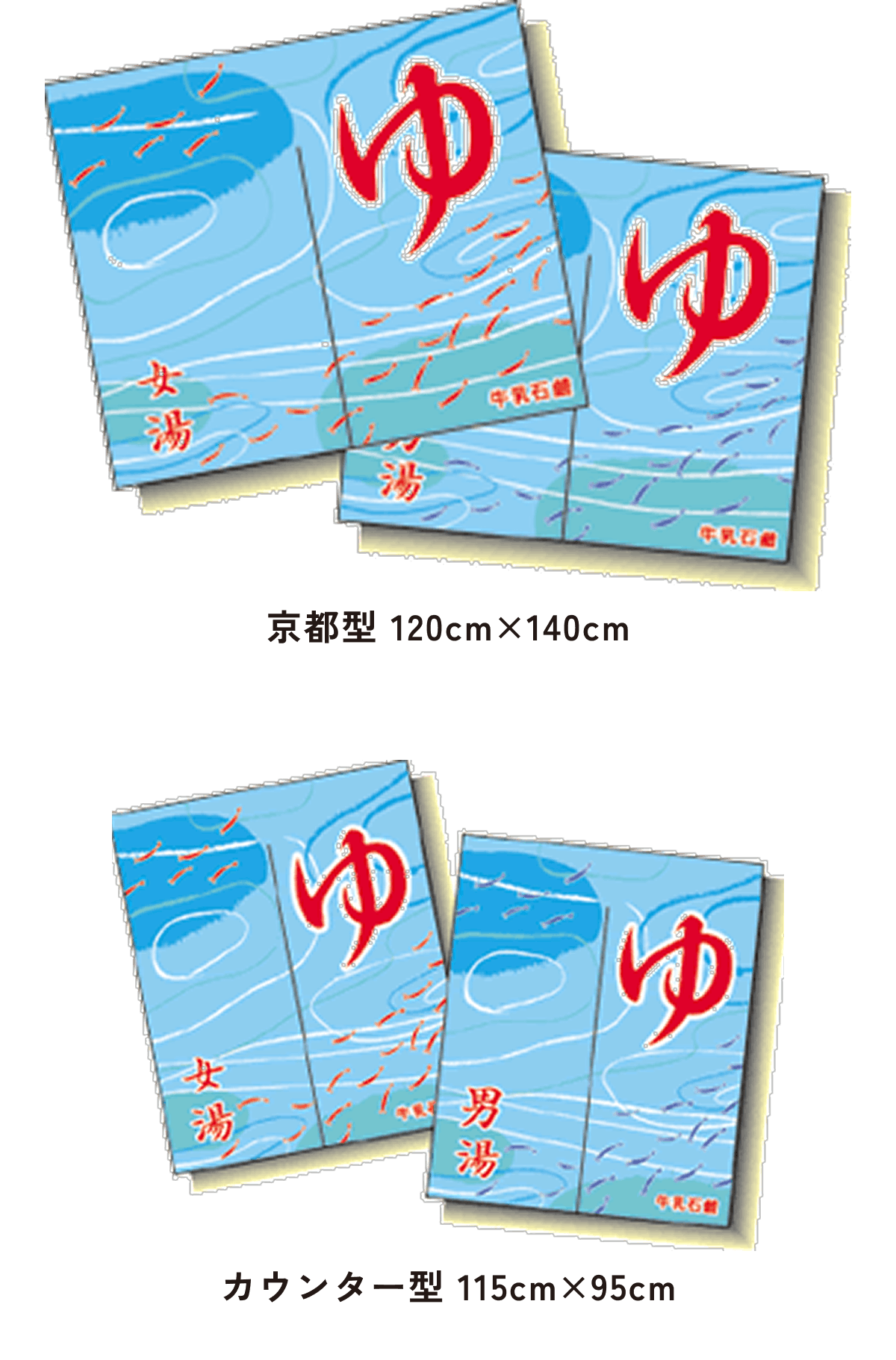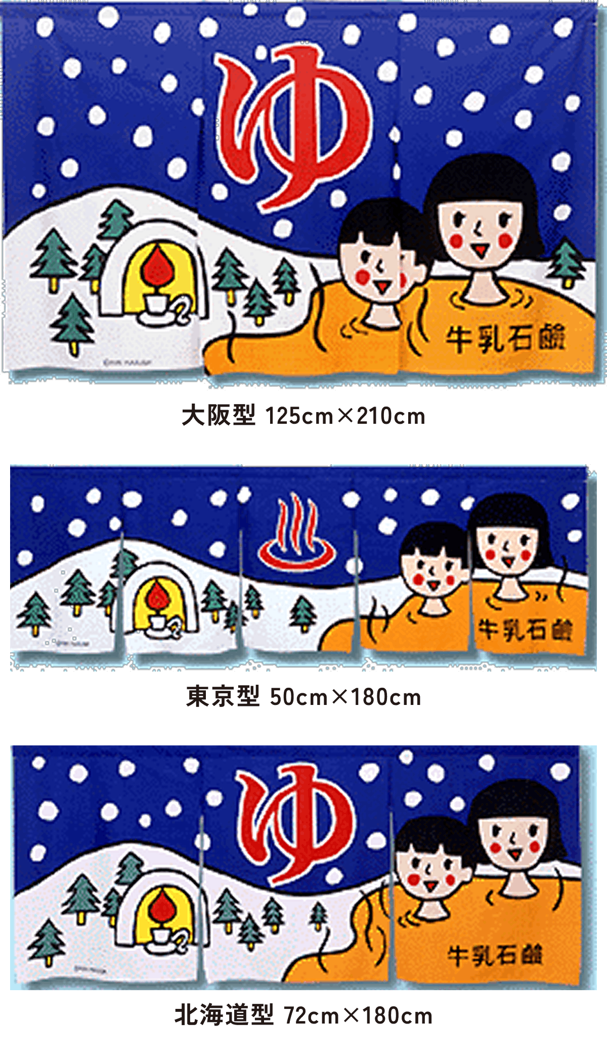また、東京型は温泉シンボルのはいったものが多く、丈の短い横長タイプです。これは手でさっとはねあげるのを粋とする江戸っ子の美意識から生まれたようです。
