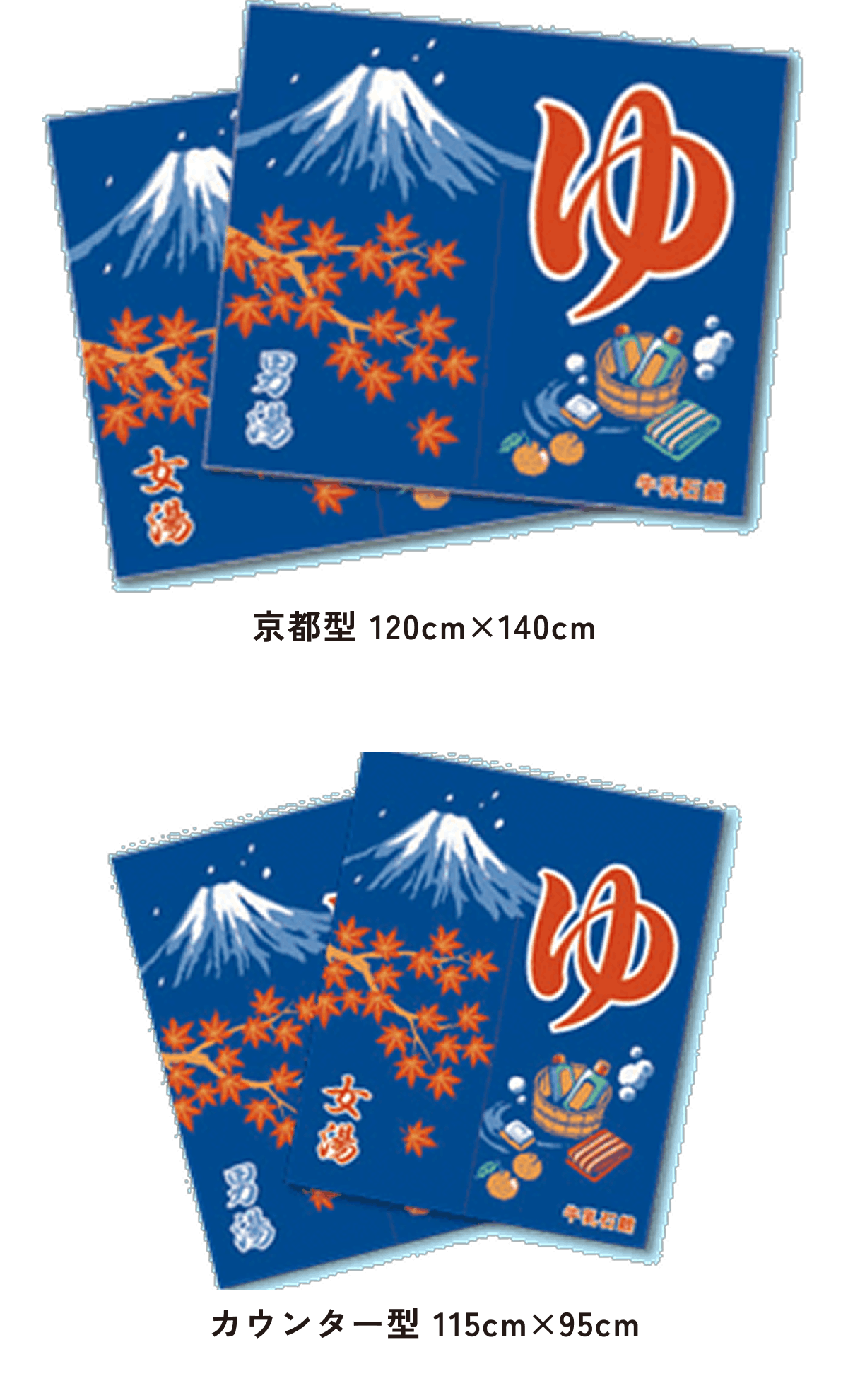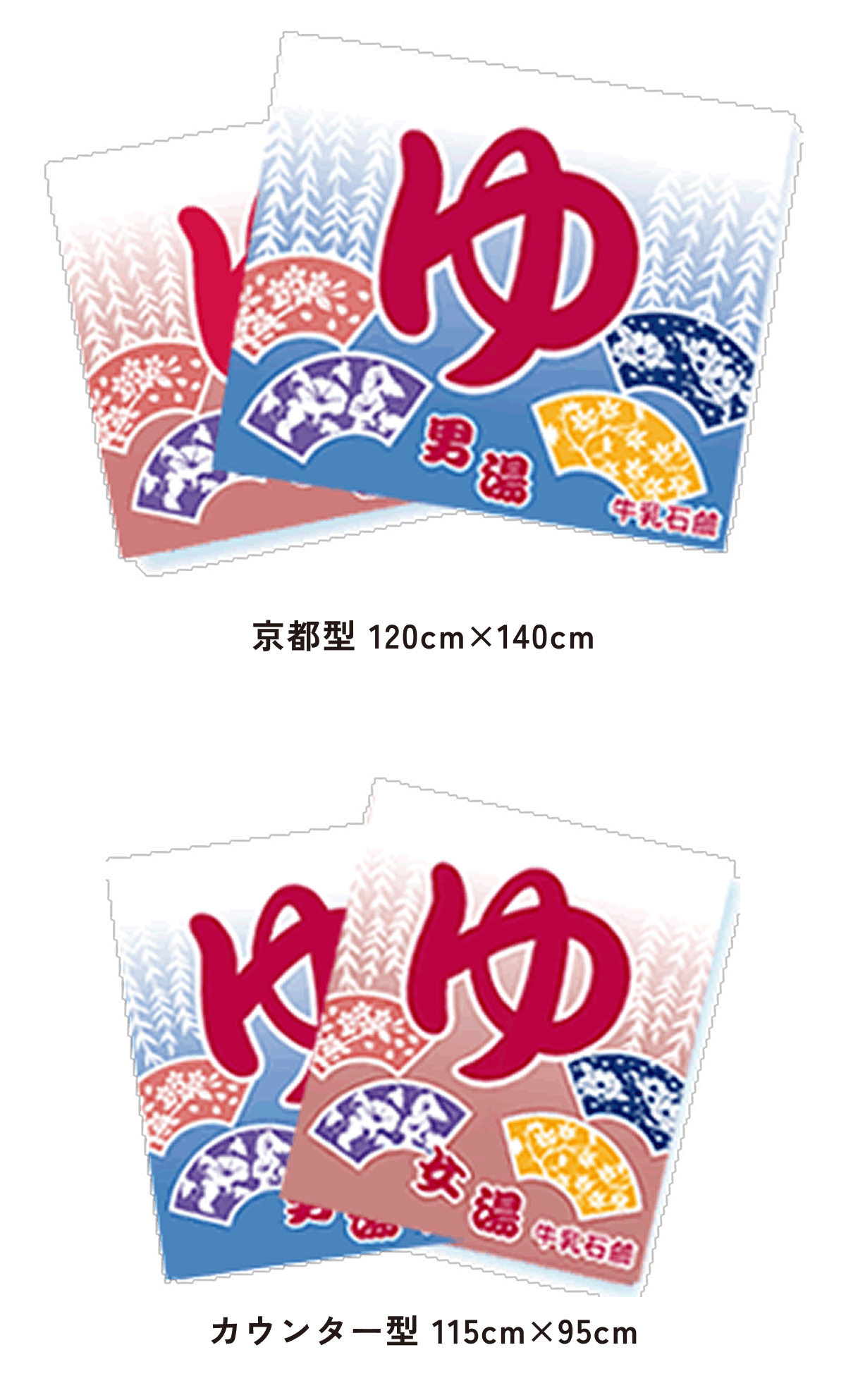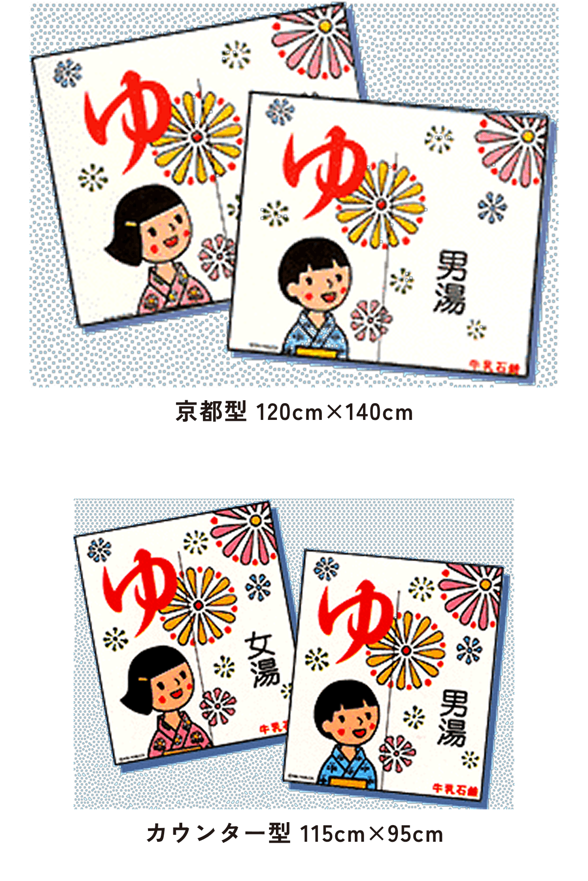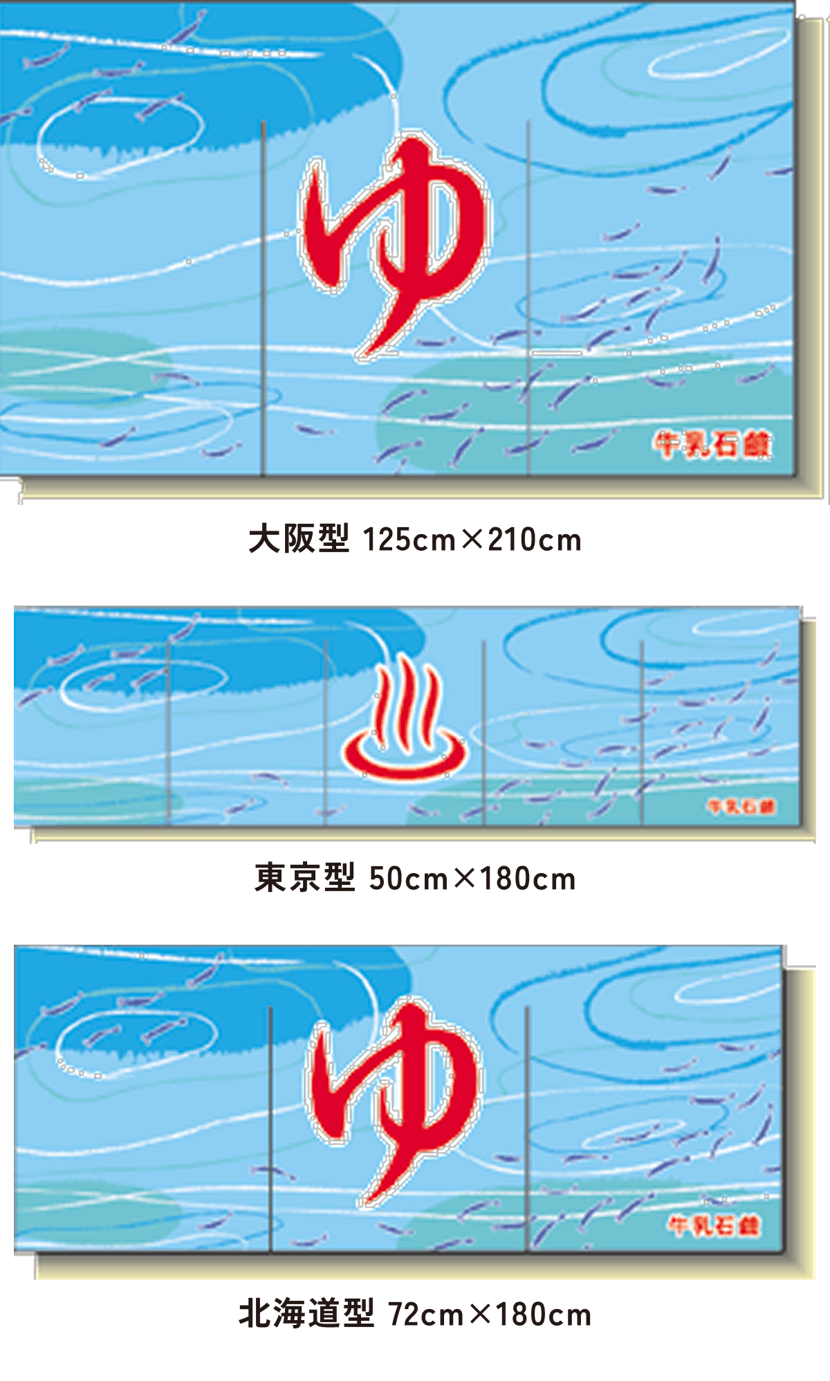 北海道型は大阪型に比べて約半分の大きさで、京都型、カウンター型は男湯と女湯に分かれていて、切れ目はまん中に1つです。