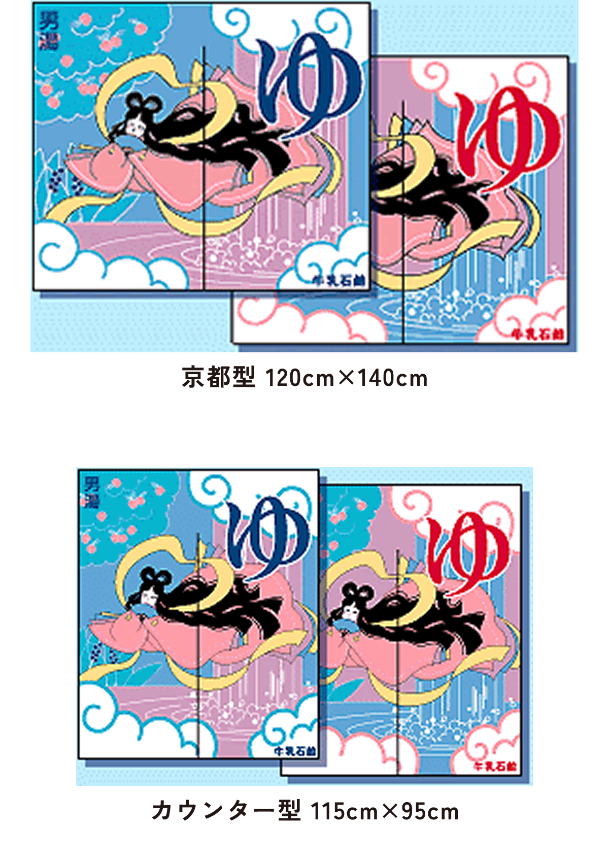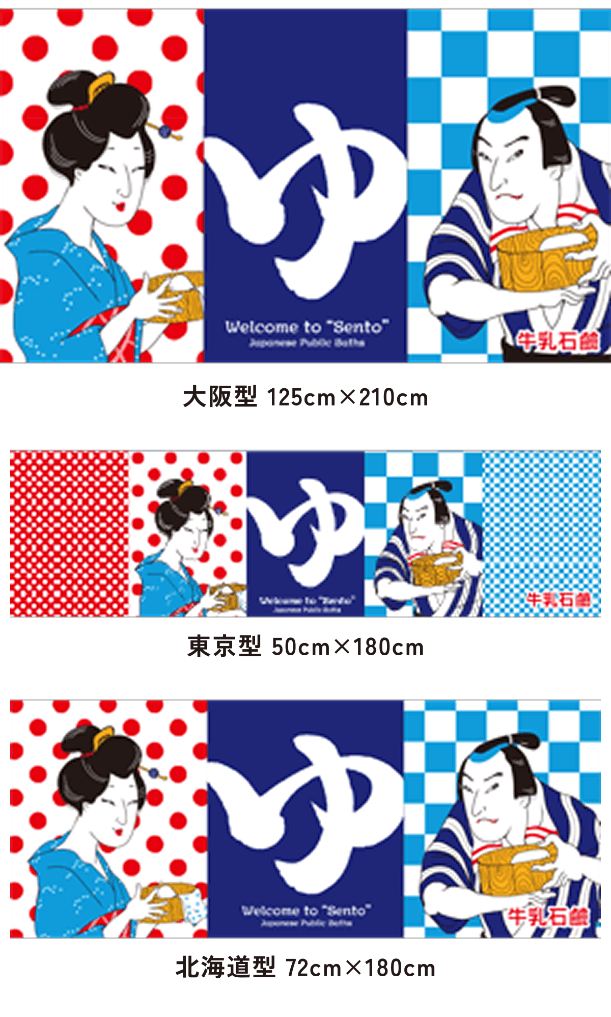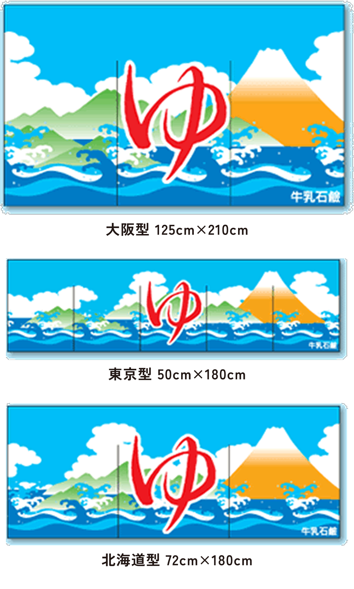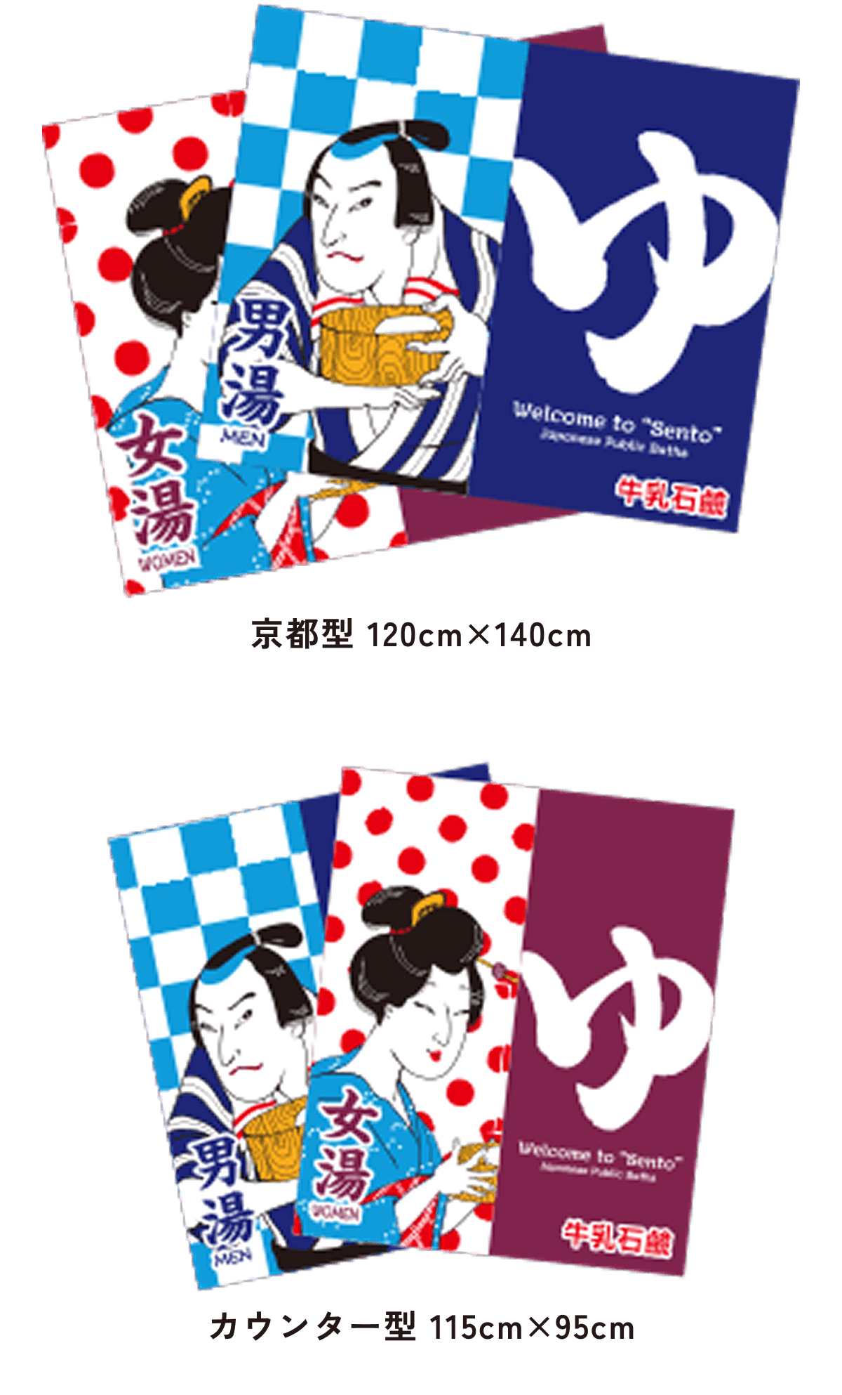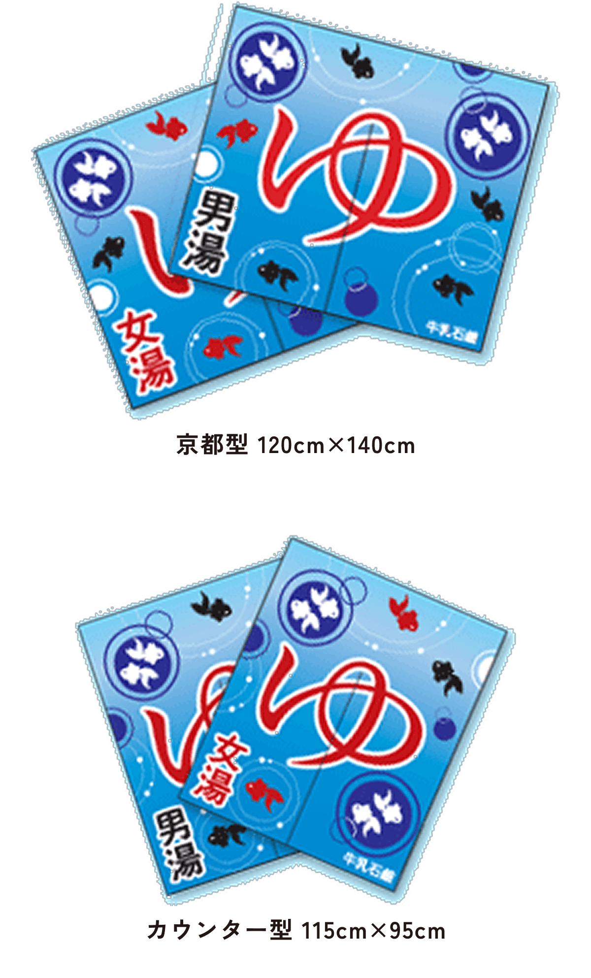 北海道型は大阪型に比べて約半分の大きさで、京都型、カウンター型は男湯と女湯に分かれていて、切れ目はまん中に1つです。
