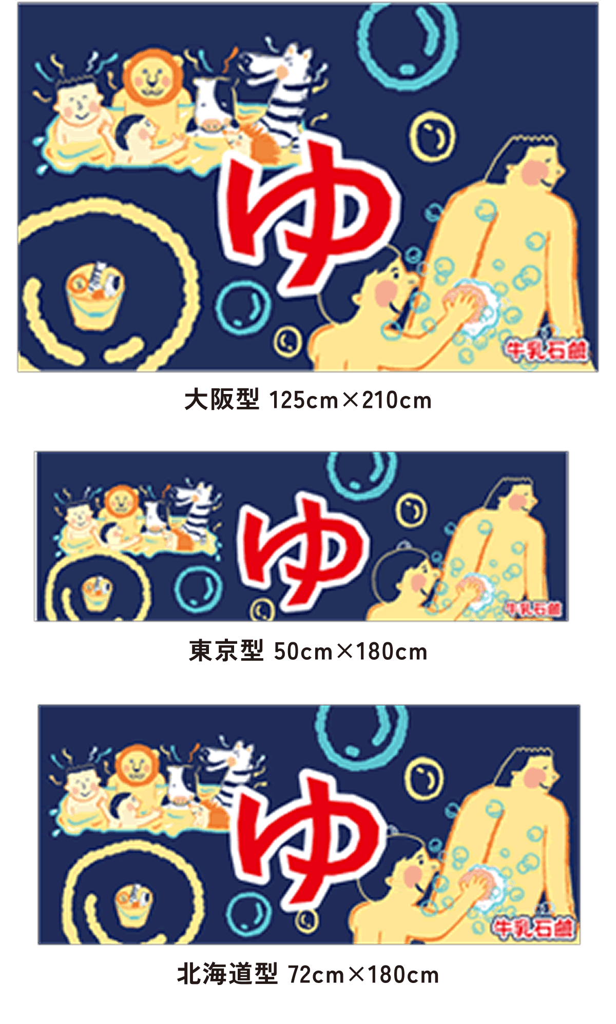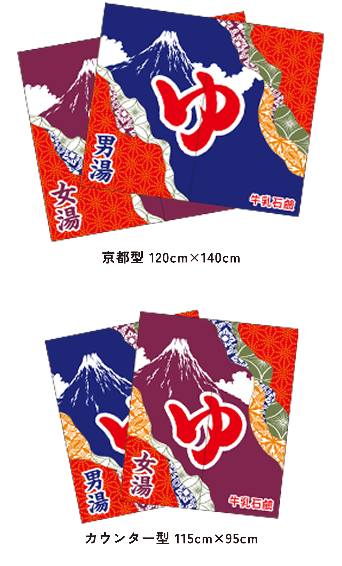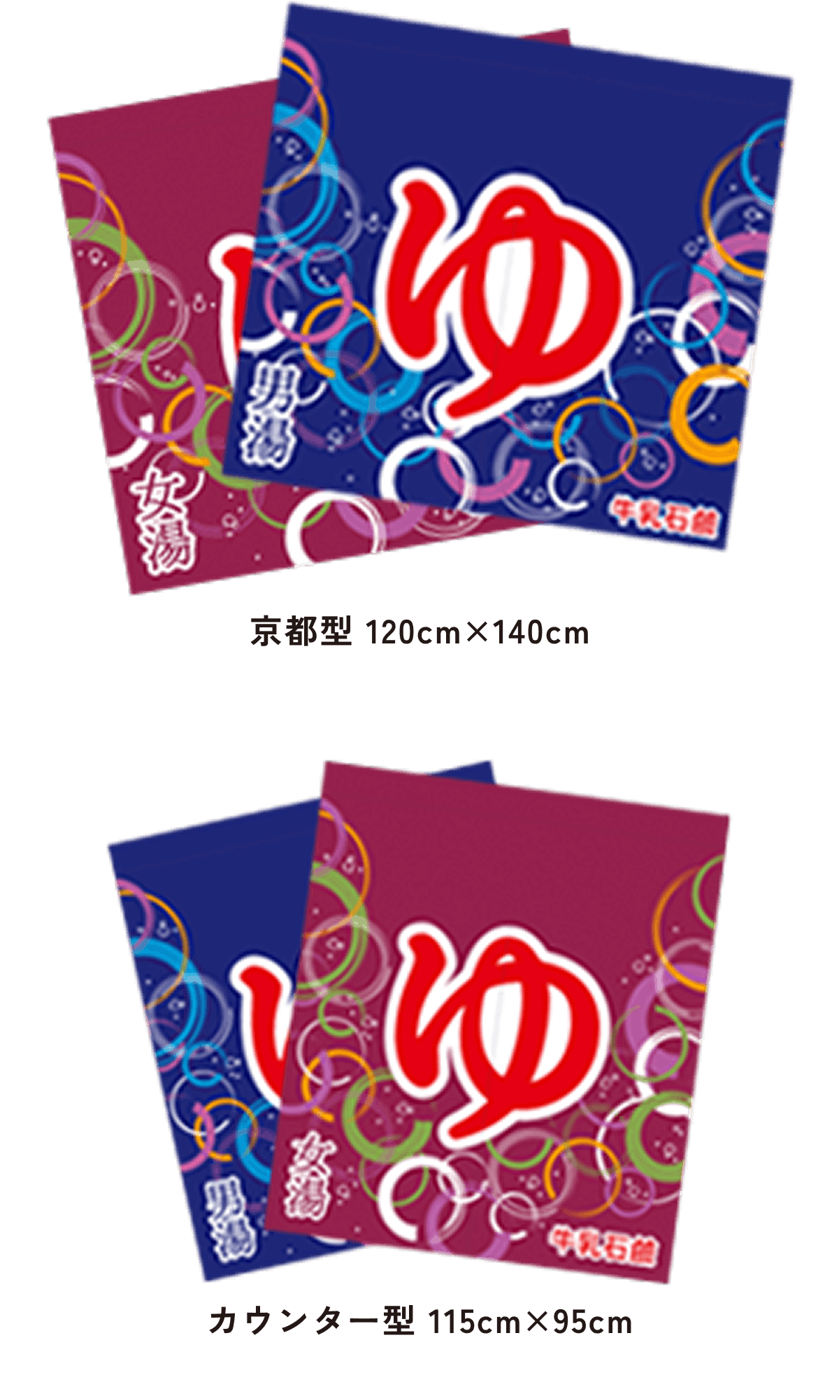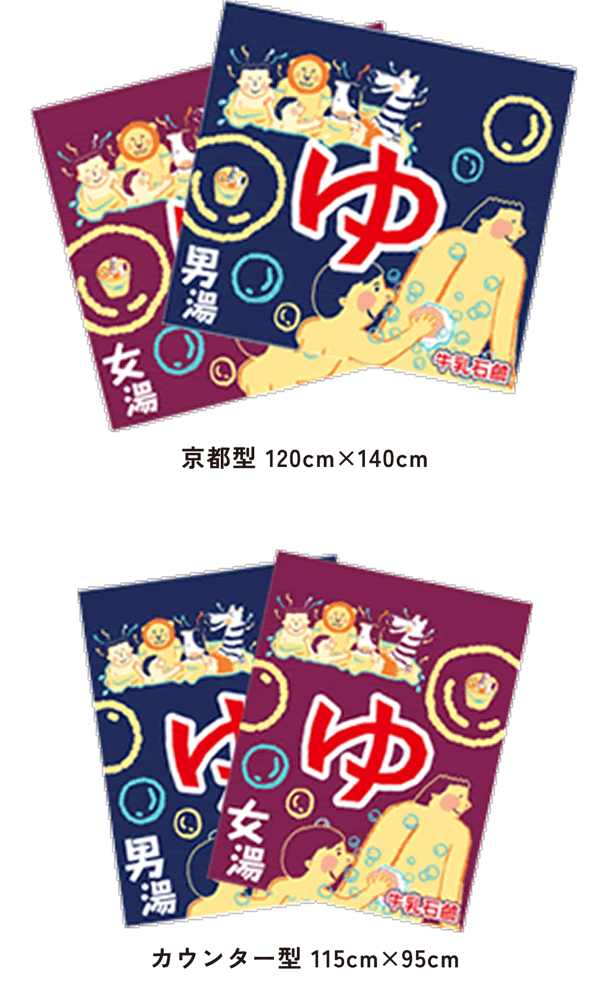 北海道型は大阪型に比べて約半分の大きさで、京都型、カウンター型は男湯と女湯に分かれていて、切れ目はまん中に1つです。