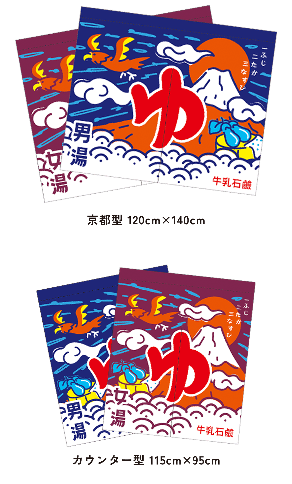 縁起の良い初夢、「一富士二鷹三茄子」を、街の銭湯のれんから発信!いつでも良い夢を見て、より多くの方に幸せ気分になっていただきたい想いを込めました。 和風タッチでありながらポップな色調で、銭湯の玄関を明るく元気に彩ります。