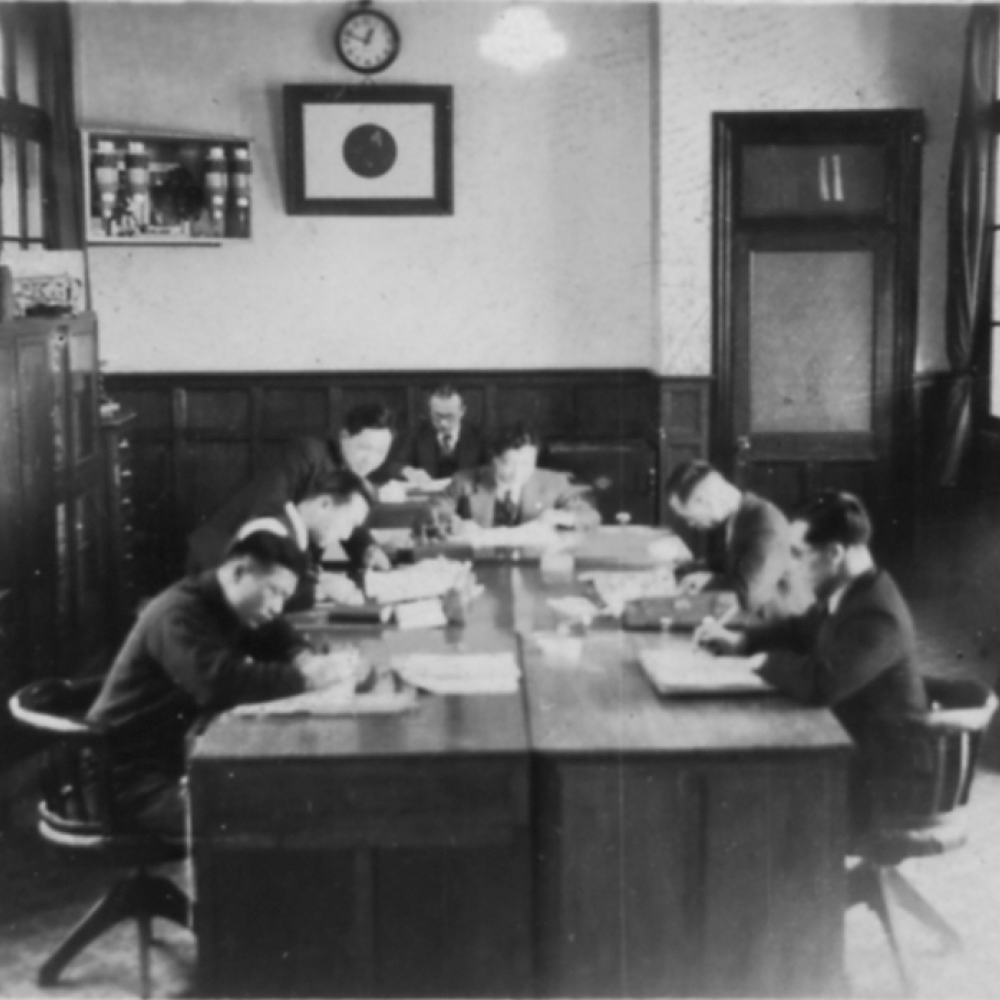 終戦とともに全社員⼀丸となって復興再建に励む。