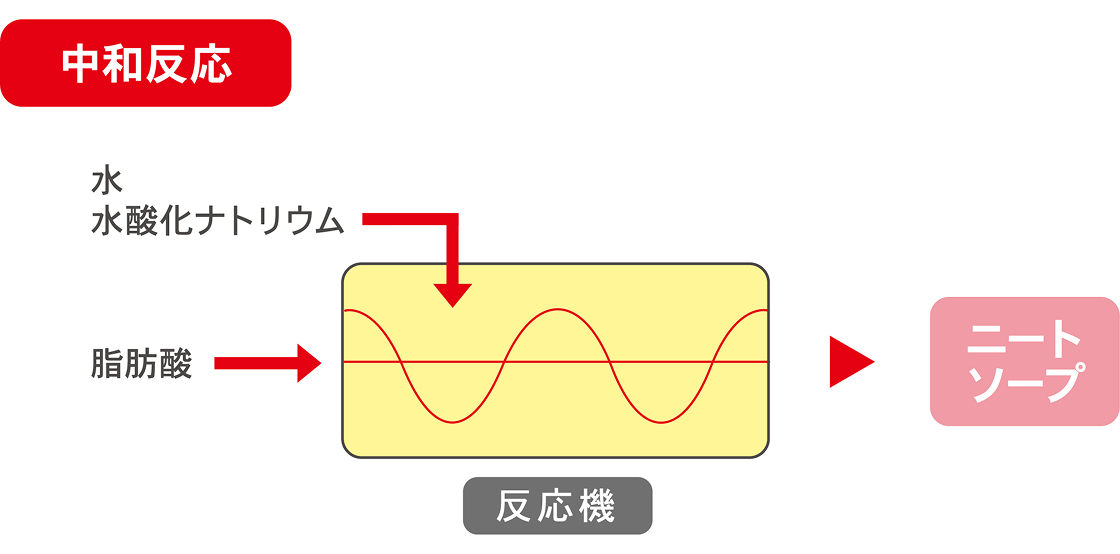 脂肪酸と水酸化ナトリウムを反応機(連続中和装置)の中で、加熱、攪拌させて反応(中和)させるニートソープができます。この方法は、反応に時間がかからないため、数時間で化粧石けんをつくることが可能で、大量生産に向いています。
