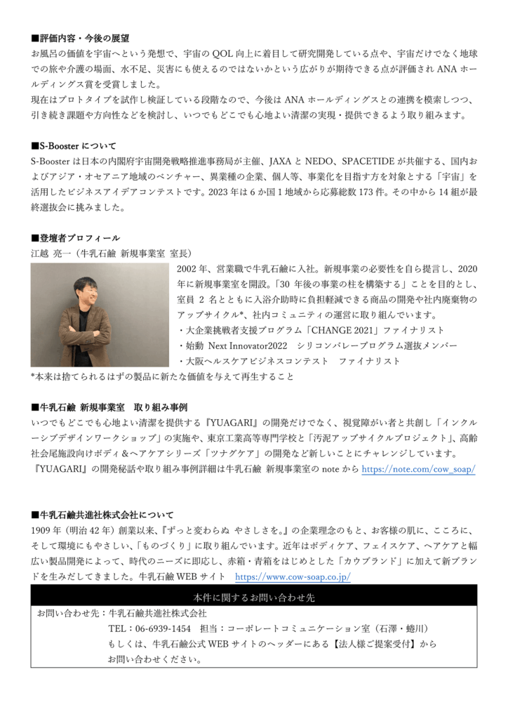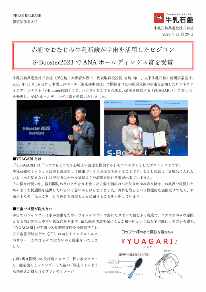 牛乳石鹼共進社株式会社(所在地:大阪府大阪市、代表取締役社長 宮崎 悌二、以下牛乳石鹼)新規事業室は、2023 年 11 月 16 日に日本橋三井ホール(東京都中央区)で開催された内閣府主催の宇宙を活用したビジネスアイデアコンテスト「S-Booster2023」にて、いつでもどこでも心地よい清潔を提供する『YUAGARI(ユアガリ)』を発表し、ANAホールディングス賞を受賞いたしました。