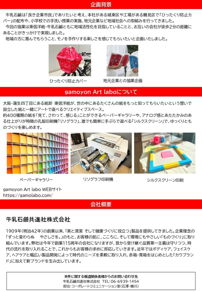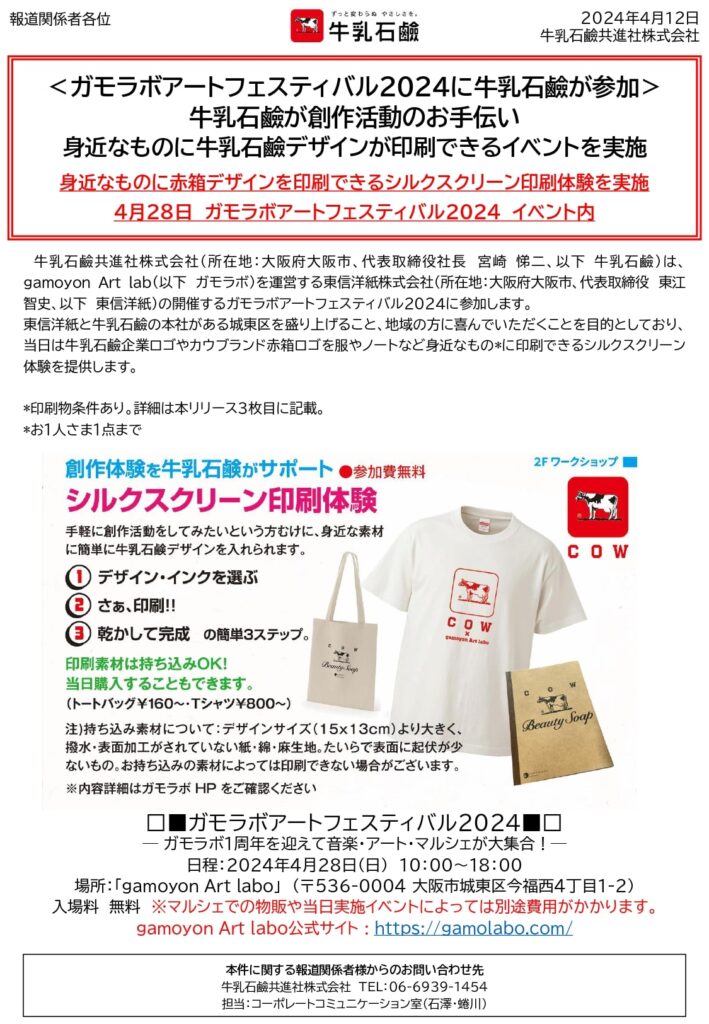 牛乳石鹼共進社株式会社(所在地:大阪府大阪市、代表取締役社長 宮崎 悌二、以下 牛乳石鹼)は、gamoyon Art lab(以下 ガモラボ)を運営する東信洋紙株式会社(所在地:大阪府大阪市、代表取締役 東江智史、以下 東信洋紙)の開催するガモラボアートフェスティバル2024に参加します。