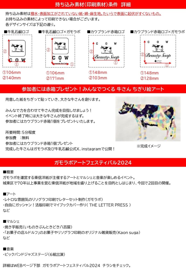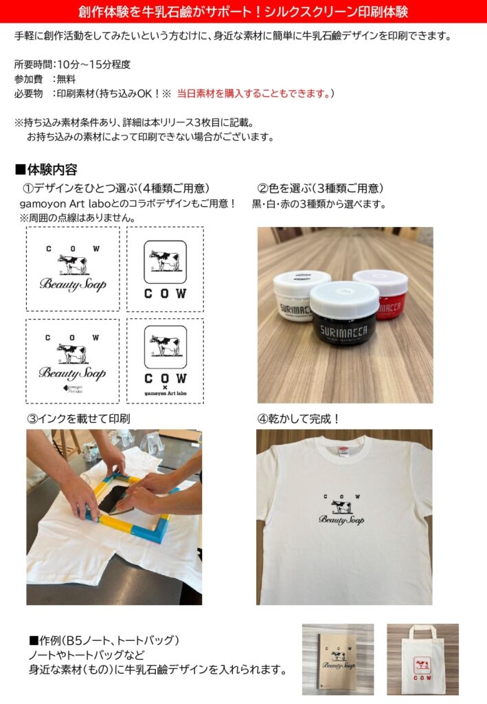 東信洋紙と牛乳石鹼の本社がある城東区を盛り上げること、地域の方に喜んでいただくことを目的としており、当日は牛乳石鹼企業ロゴやカウブランド赤箱ロゴを服やノートなど身近なもの*に印刷できるシルクスクリーン体験を提供します。
