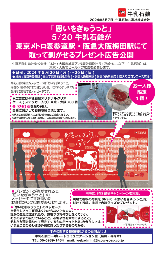 牛乳石鹼共進社株式会社(本社 : 大阪市城東区、代表取締役社長 : 宮崎悌二、以下 : 牛乳石鹼)は、東京・大阪でピールオフ広告を公開します。