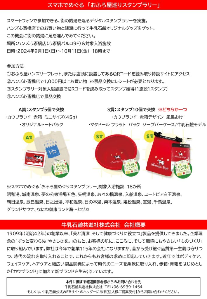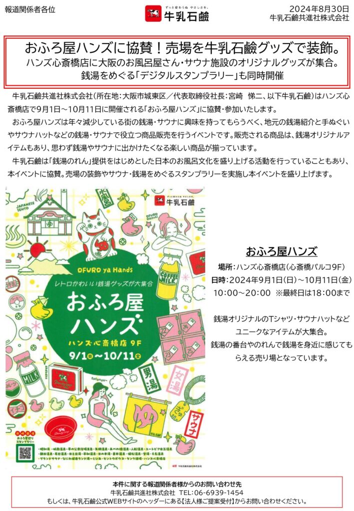 牛乳石鹼共進社株式会社(所在地:大阪市城東区/代表取締役社長:宮崎 悌二、以下牛乳石鹼)はハンズ心斎橋店で9月1日~10月11日に開催される「おふろ屋ハンズ」に協賛・参加いたします。