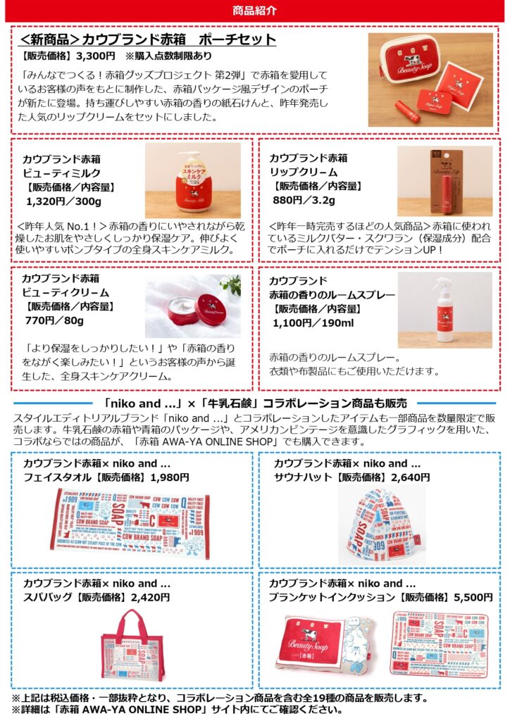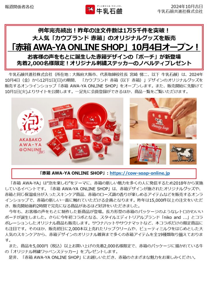 ⽜乳⽯鹸共進社株式会社(所在地︓⼤阪府⼤阪市、代表取締役社⻑ 宮崎 悌⼆、以下 ⽜乳⽯鹸)は、2024年10⽉4⽇(⾦)から12⽉1⽇(⽇)の期間、 「カウブランド ⾚箱(以下 ⾚箱)」デザインのオリジナルグッズを販売するオンラインショップ「⾚箱 AWA-YA ONLINE SHOP」をオープンします。また、販売開始に先駆けて10⽉1⽇(⽕)よりサイトを公開します。⼀⾜先に会員登録ができるほか、商品⼀覧をご覧いただけます。