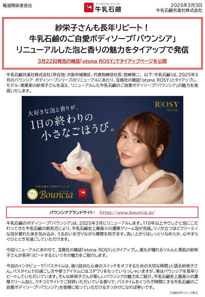 牛乳石鹼共進社株式会社(所在地:大阪市城東区、代表取締役社長:宮崎悌二、 以下:牛乳石鹼)は、2025年3月のバウンシア ボディソープシリーズのリニューアルにあたり、宝島社の雑誌「otona ROSY」とタイアップし、モデル・実業家の紗栄子さんを迎え、リニューアルした牛乳石鹼のご自愛ボディソープ「バウンシア」の魅力を発信いたします。
