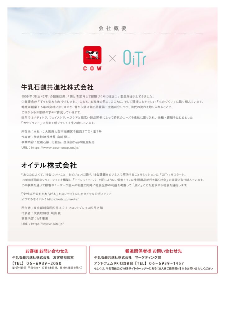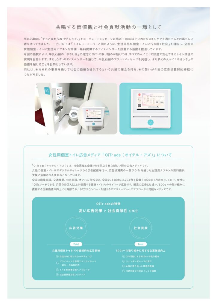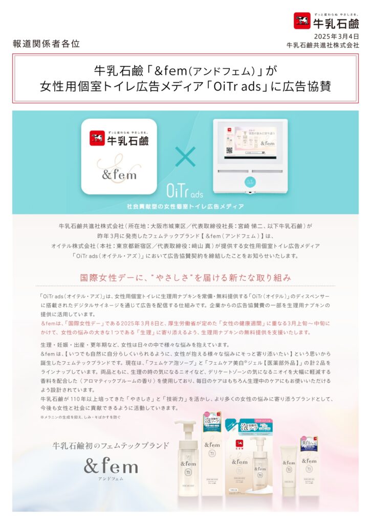 牛乳石鹸共進社株式会社(所在地:大阪市城東区/代表取締役社長:宮崎 悌二、以下牛乳石鹸)が昨年3月に発売したフェムテックブランド 【&fem(アンドフェム)】 は、オイテル株式会社(本社:東京都新宿区、代表取締役:﨑山 真)が提供する女性用個室トイレ広告メディア「OiTr ads(オイテル・アズ)」において広告協賛契約を締結したことをお知らせいたします。