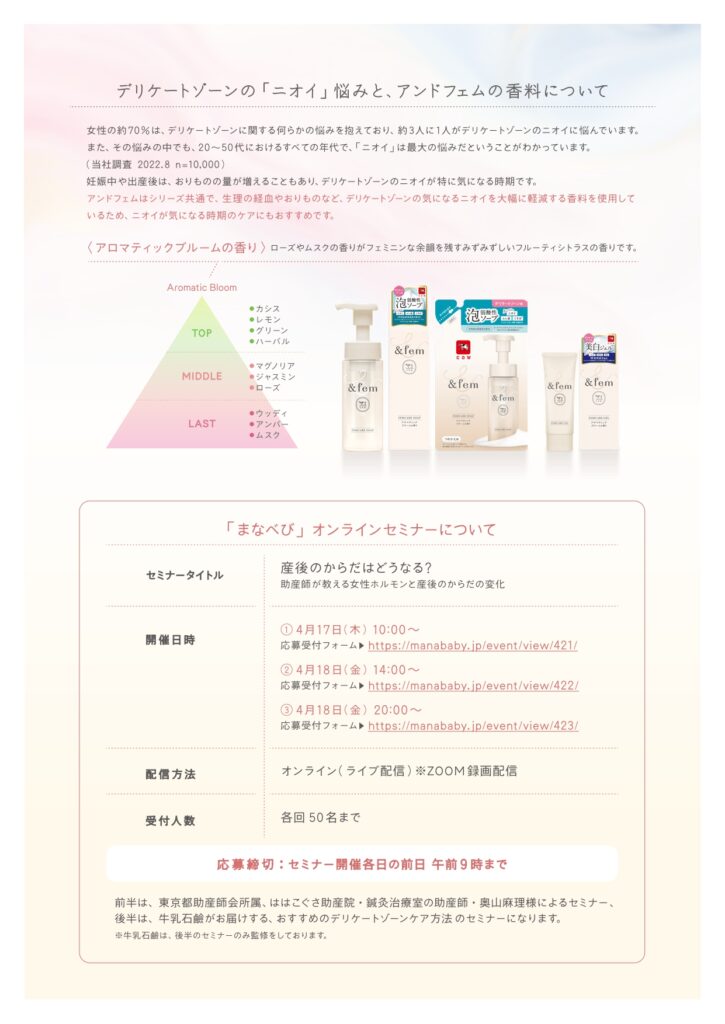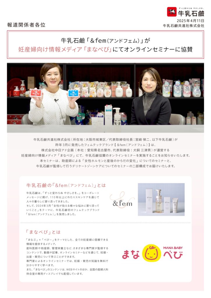 牛乳石鹸共進社株式会社(所在地:大阪市城東区/代表取締役社長:宮崎 悌二、以下牛乳石鹸)が昨年3月に発売したフェムテックブランド【&fem(アンドフェム)】 は、株式会社中日アド企画(本社:愛知県名古屋市、代表取締役:犬飼 三津男)が運営する妊産婦向け情報メディア「まなべび」にて、牛乳石鹸協賛のオンラインセミナーを実施することをお知らせいたします。
