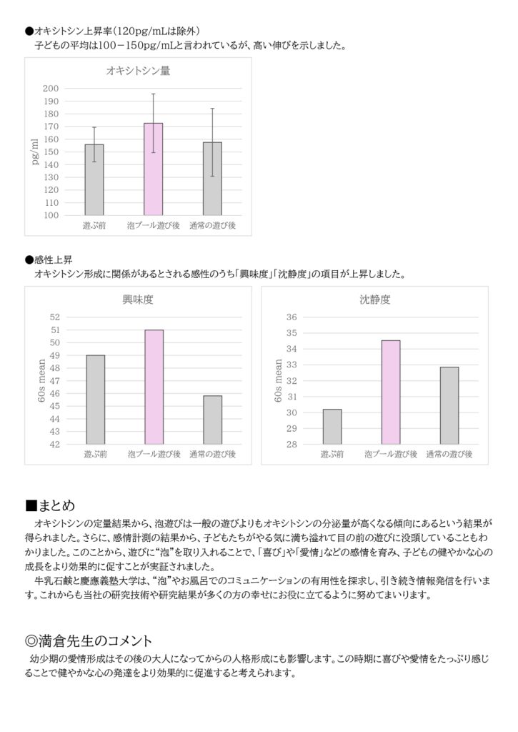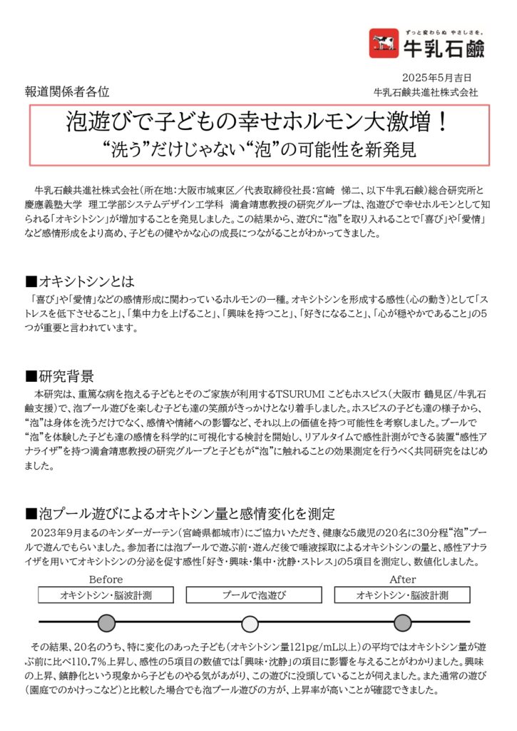 牛乳石鹸共進社株式会社(所在地:大阪市城東区/代表取締役社長:宮崎 悌二、以下牛乳石鹸)総合研究所と慶應義塾大学 理工学部システムデザイン工学科 満倉靖恵教授の研究グループは、泡遊びで幸せホルモンとして知られる「オキシトシン」が増加することを発見しました。この結果から、遊びに“泡”を取り入れることで「喜び」や「愛情」など感情形成をより高め、子どもの健やかな心の成長につながることがわかってきました。