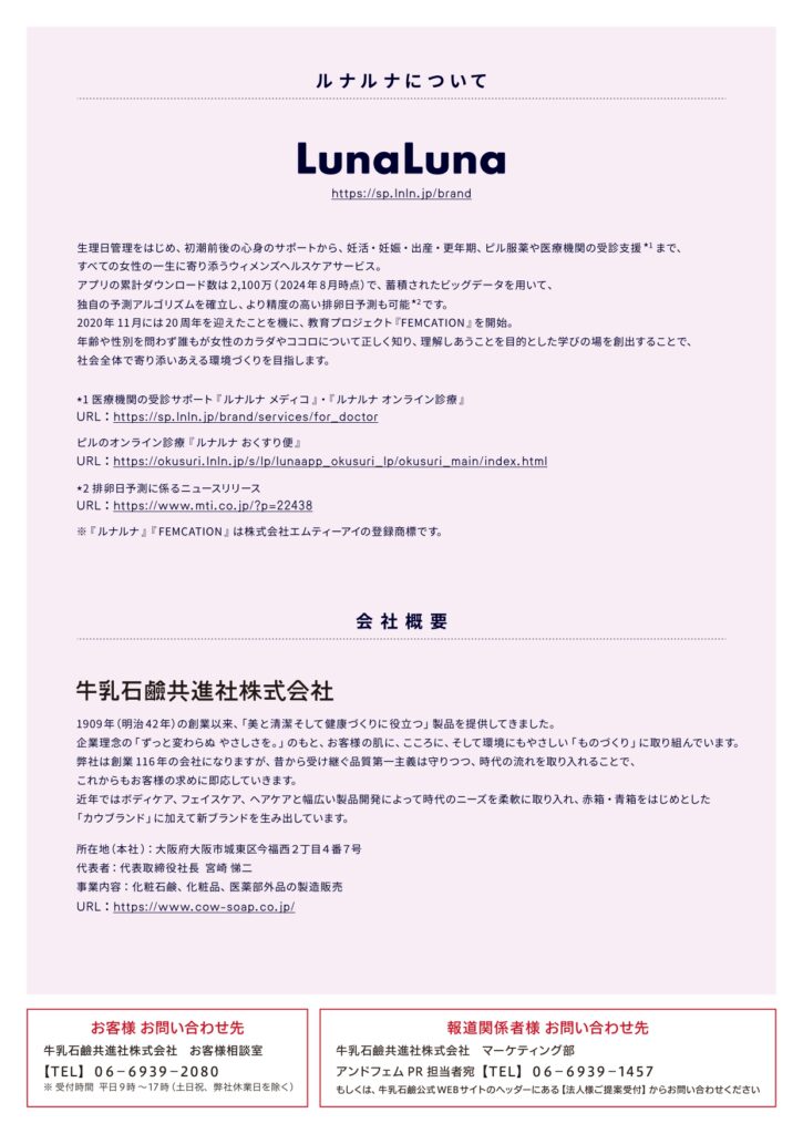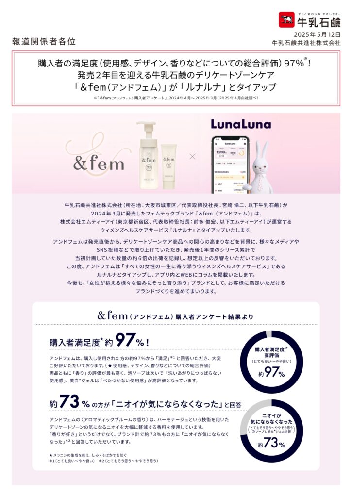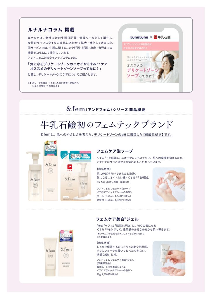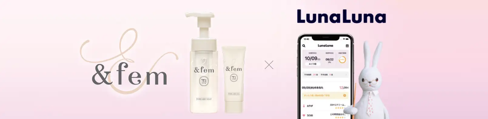 牛乳石鹸共進社株式会社(所在地:大阪市城東区/代表取締役社長:宮崎 悌二、以下牛乳石鹸)が2024年3月に発売したフェムテックブランド『&fem(アンドフェム)』は、株式会社エムティーアイ(東京都新宿区、代表取締役社長:前多 俊宏、以下エムティーアイ)が運営するウィメンズヘルスケアサービス『ルナルナ』とタイアップいたします。