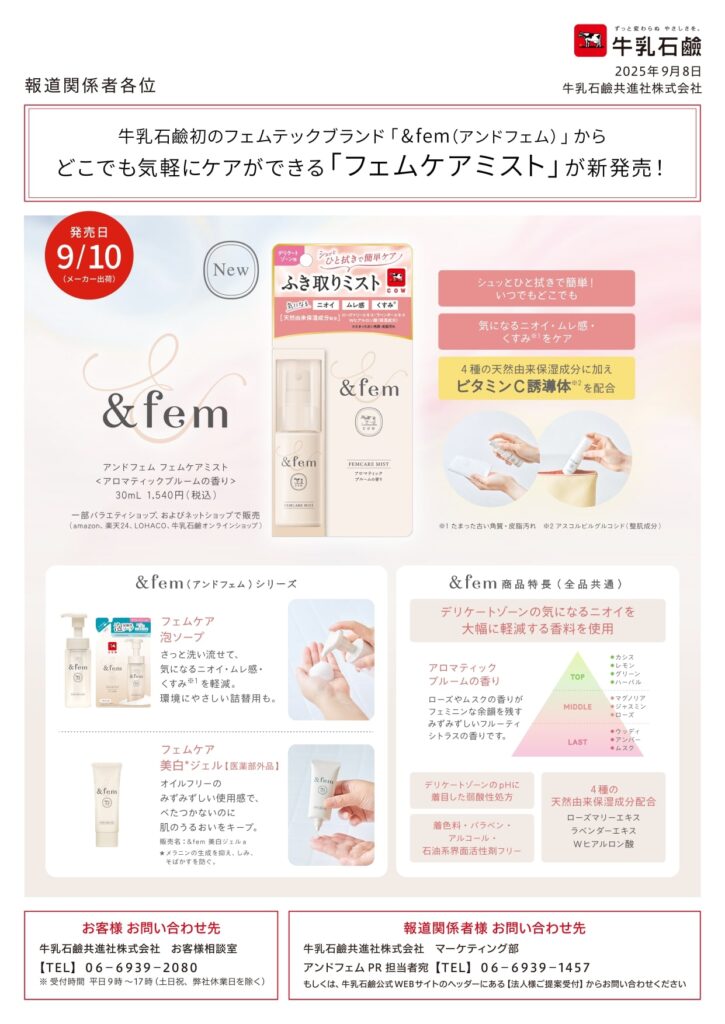 牛乳石鹸共進社株式会社(所在地:大阪市城東区、代表取締役社長:宮崎悌二、以下:牛乳石鹸)は、2024年3月に生まれた牛乳石鹸初のデリケートゾーンケア「&fem(アンドフェム)」より「フェムケアミスト」をこの秋新発売いたします。 いつでもどこでも、気になる【ニオイ・ムレ感・くすみ ※1】をシュッとひと拭きで簡単にケアしていただけます。