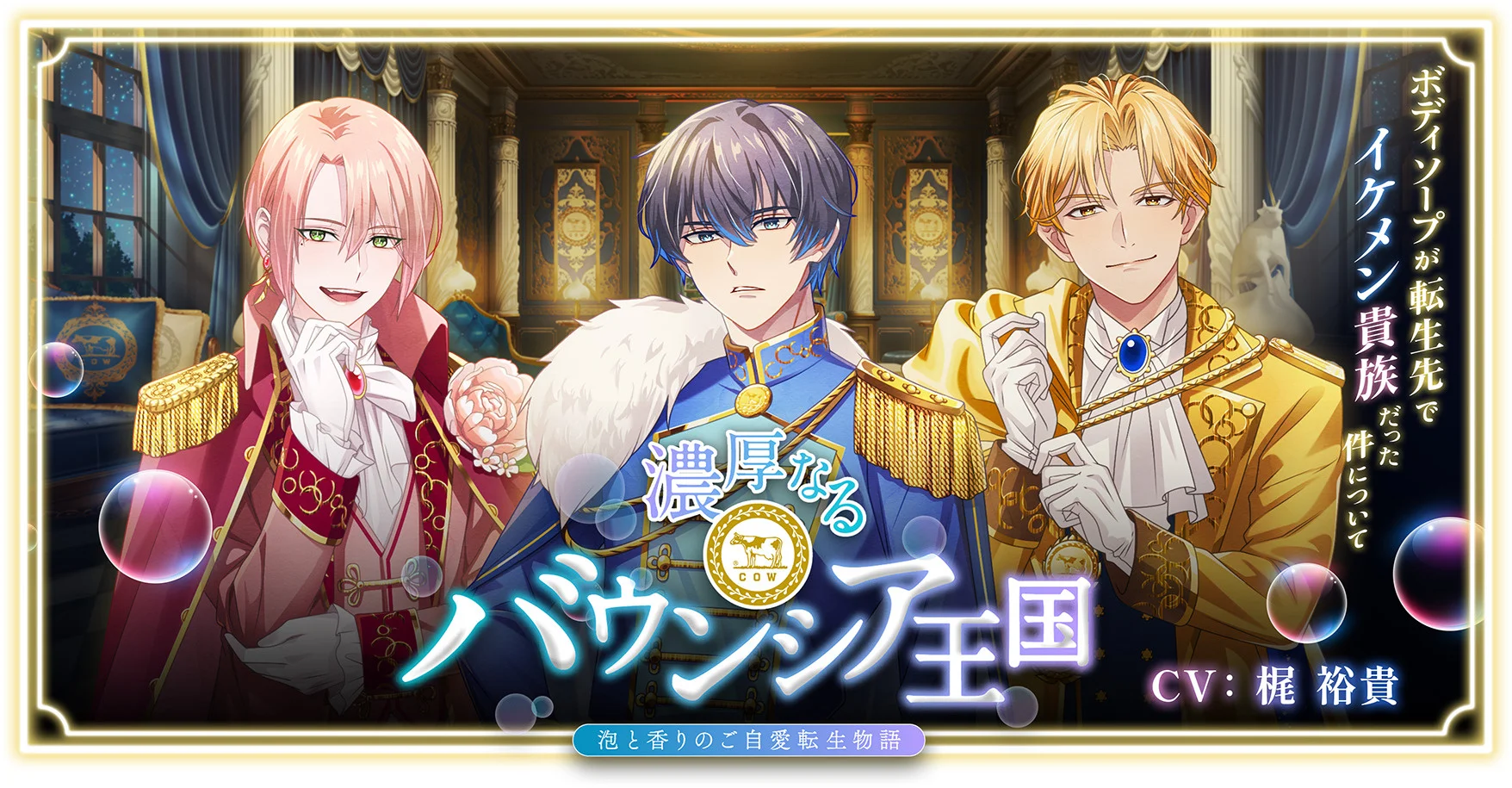 没入ボイス動画(バイノーラル音声)は、主人公が転生した異世界『バウンシア王国』で、バウンシアをモチーフとした3人のイケメン貴族(CV.梶裕貴)と出会う物語です。