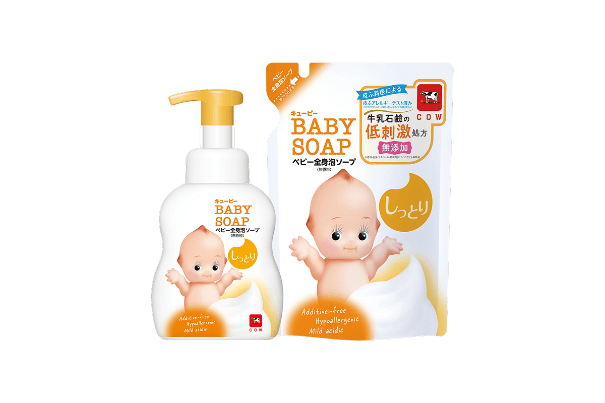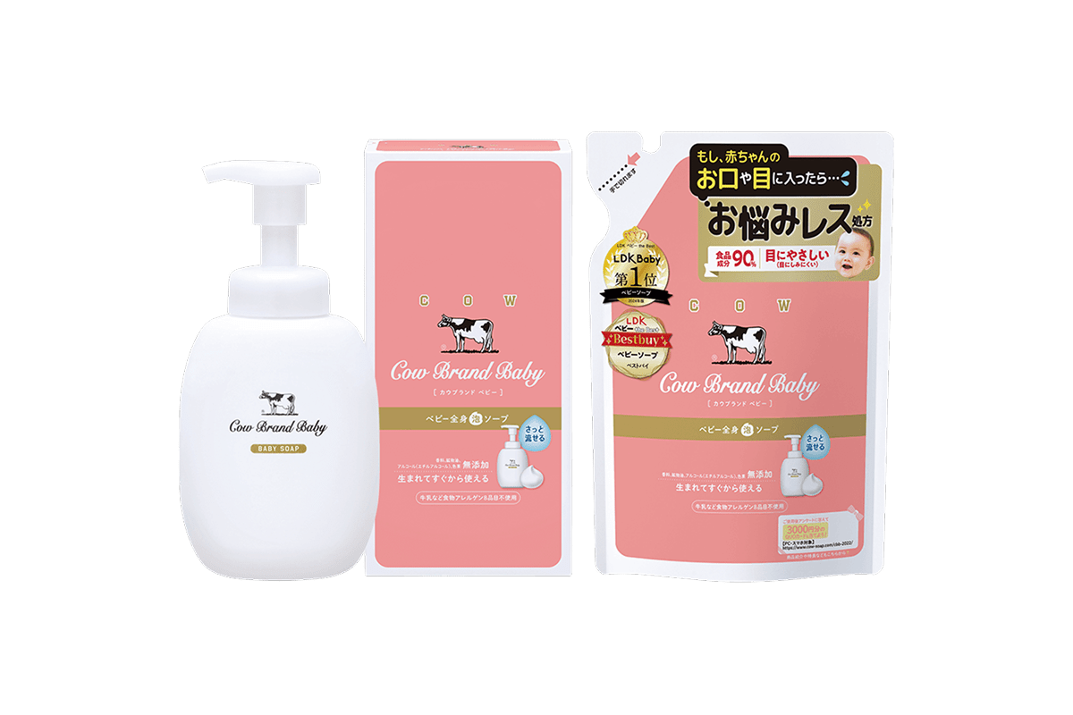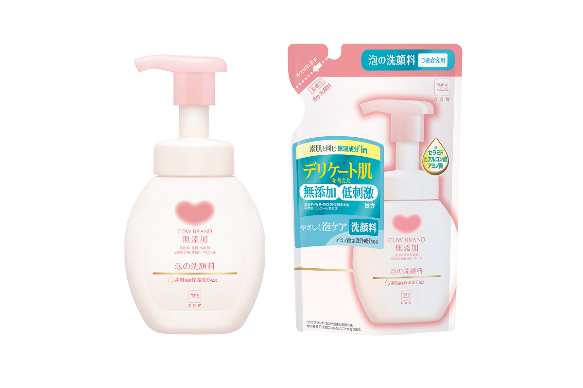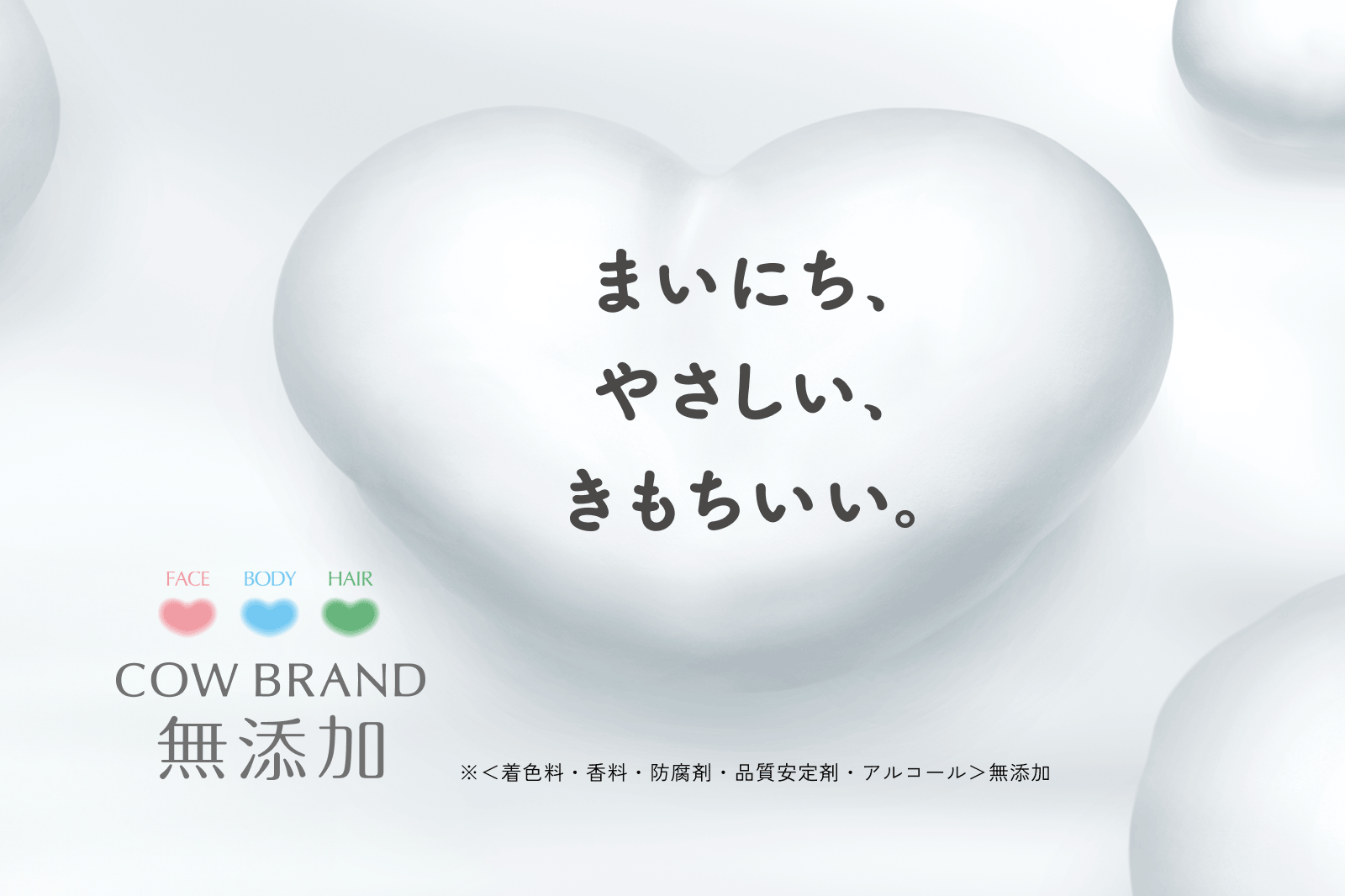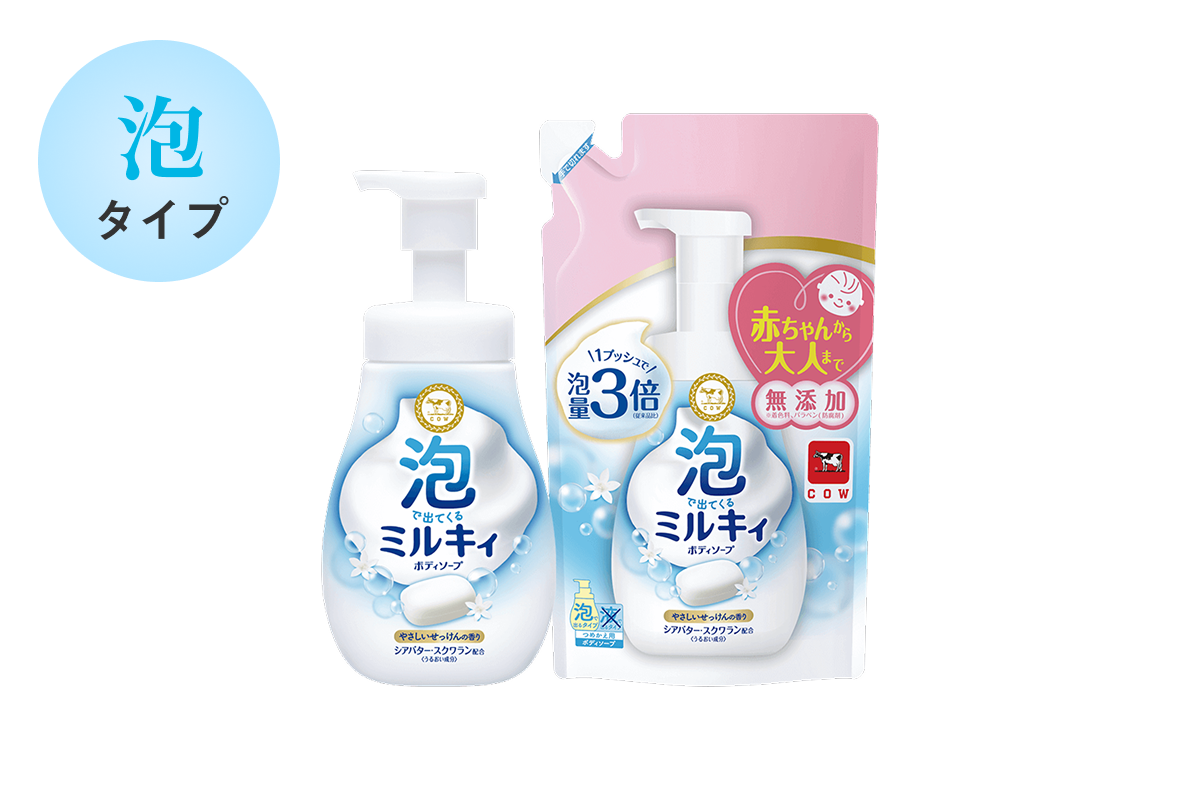 カウブランド無添加シリーズはデリケート肌にも刺激が少ないのはもちろんのこと、もっちりクッション泡に包まれて、うるおいしあわせな気分。