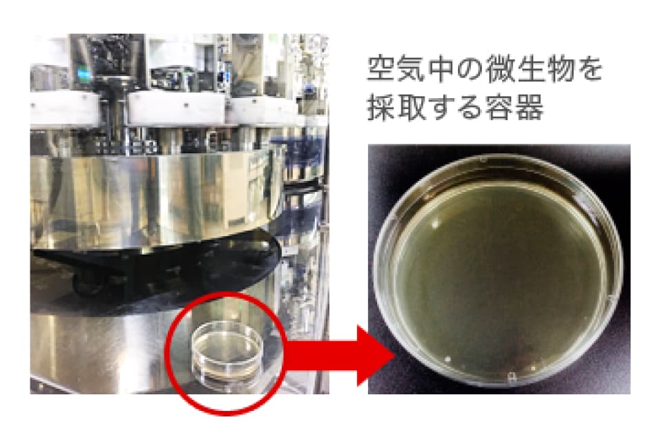 一次汚染(注1)を防ぐためには衛生的な製造が基本であり、当社では製品生菌検査や工場内環境調査をおこなっています。工場内では、空気中の微生物量を継続的に測定し、製品への微生物汚染を監視(写真1)しています。この調査にて基準以上の微生物が見られた場合、清掃状態や清掃方法などの見直しがおこなわれます。一方、二次汚染(注2)を防ぐためには適切な防腐処方設計が必要であり、当社ではチャレンジテスト(保存効力試験)をおこなっています(写真2)。このように当社では様々な微生物管理をおこなっており、これらに合格したものだけが製品として出荷され、お客様の手元に届きます。