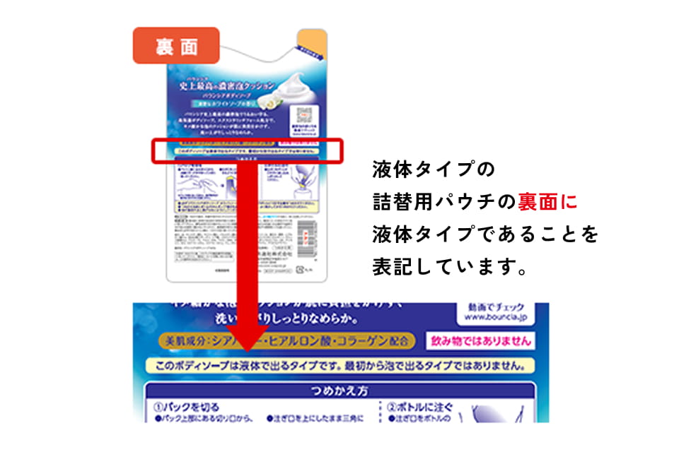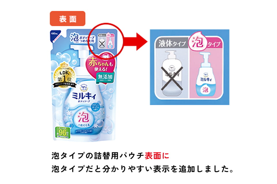 ミルキィボディソープには液体タイプと泡タイプの2種類がありますが、泡タイプのボトルに液体タイプのボディソープを間違って詰め替えてしまい、泡が正常に出ないという声を多くいただきました。そこで、泡タイプの詰め替え用パウチの表面に泡タイプだと分かりやすい表示を追加しました。 また、バウンシアボディソープは液体タイプなのですが、濃密泡が特長の商品であるため、デザインにも泡を取り入れており、お客様から泡タイプの商品だと誤認される声をいただきました。そこで、詰め替え用パウチの裏面に液体タイプであることの文章を入れております。
