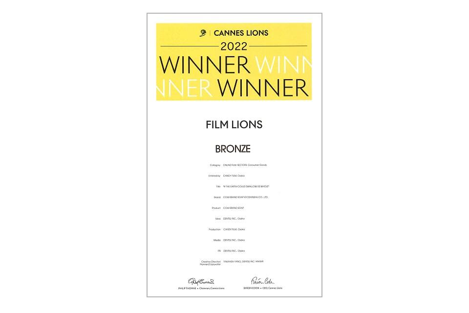 牛乳石鹸企業ムービー『穴があったら』篇が2022年第69回「カンヌライオンズ国際クリエイティビティ・フェスティバル」フィルム部門でブロンズを受賞いたしました。