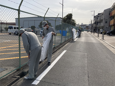 地域・環境活動の一環として、本社・支店では年に4回、安田工場では年に2回、外周の清掃活動に取り組んでいます。